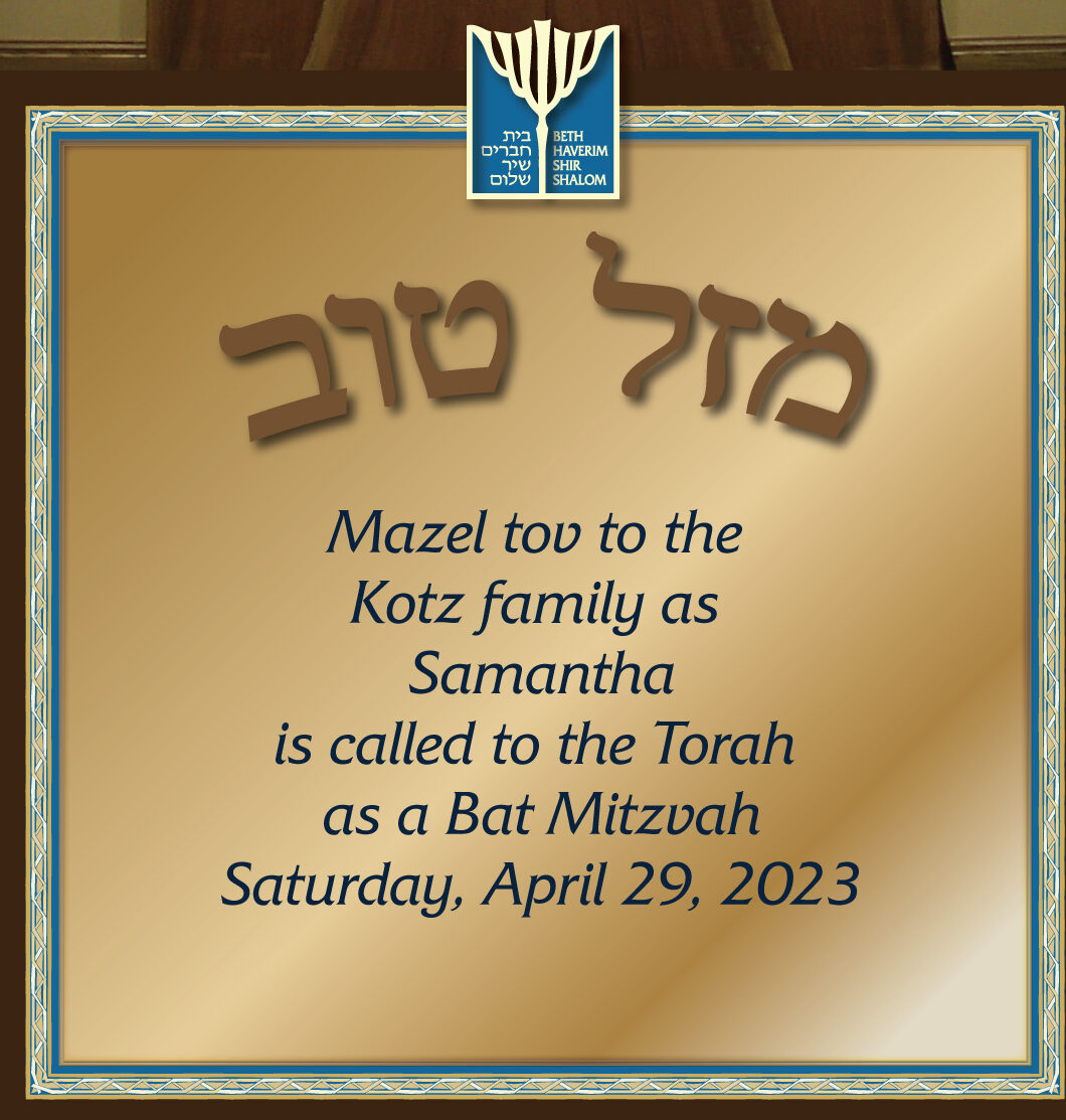 April 29, 2023 @ 10:00 am - 11:30 am Bat Mitzvah of Samantha Kotz Beth Haverim Shir Shalom 280 Ramapo Valley Road, Mahwah
