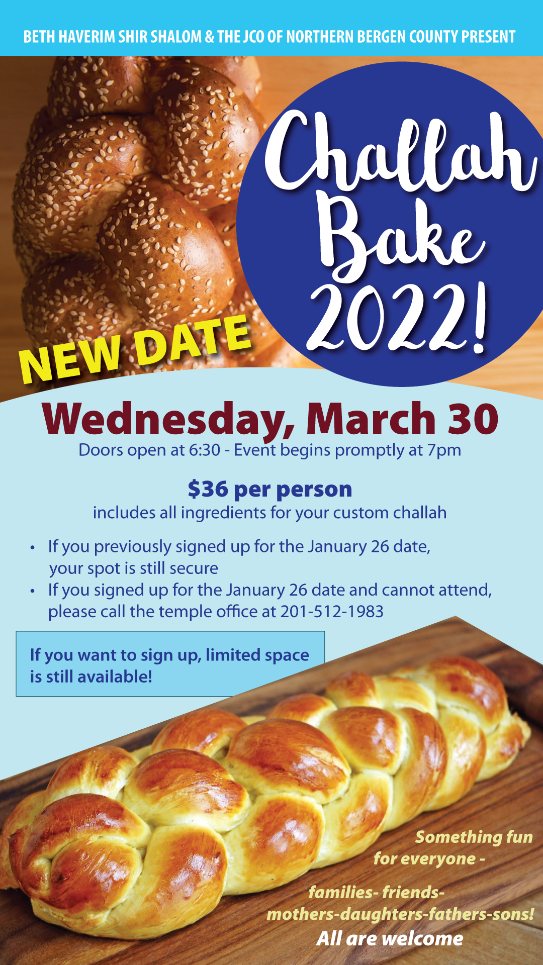 « All Events This event has passed. BHSS/JCO Challah Bake March 30, 2022 @ 6:30 pm - 9:00 pm « Shabbat Evening Service Shabbat Evening service » Add to calendar Google Calendar iCalendar Outlook 365 Outlook Live Details Date: March 30, 2022 Time: 6:30 pm - 9:00 pm
