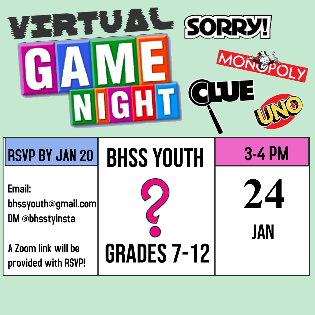 « All Events This event has passed. BHSSTY Online Game Night January 24, 2021 @ 3:00 pm - 4:00 pm « Bat Mitzvah of Shyia Prizel A Little Night Music with Cantor Josh » Ditch the cold of January and prepare for some friendly competition! RSVPs and questions to [email protected] Add to calendar Google Calendar iCalendar Outlook 365 Outlook Live Details Date: January 24, 2021 Time: 3:00 pm - 4:00 pm Venue Virtual via Zoom