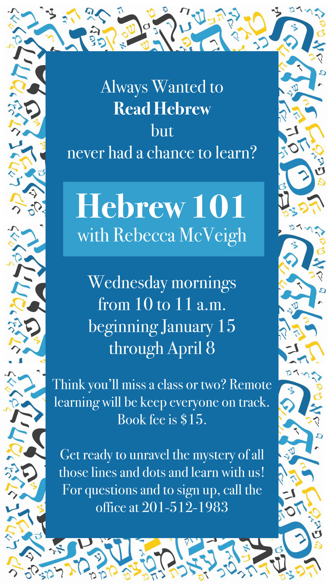 « All Events This event has passed. Event Series: Hebrew 101 Hebrew 101 January 15, 2020 @ 10:00 am - 11:00 am « Learn to Chant Torah Trope Back 2 Basics » NOTE: Must sign up and pay book fee! Add to calendar Google Calendar iCalendar Outlook 365 Outlook Live Details Date: January 15, 2020 Time: 10:00 am - 11:00 am Series: Hebrew 101 Venue Beth Haverim Shir Shalom 280 Ramapo Valley Road Mahwah, NJ 07430 United States + Google Map Phone 201-512-1983 View Venue Website
