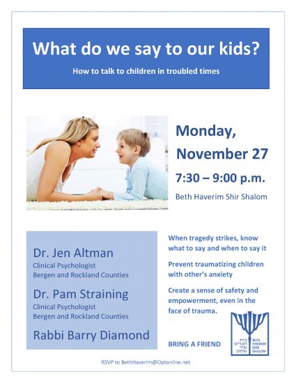 « All Events This event has passed. What Do We Say to Our Kids? November 27, 2017 @ 7:30 pm - 9:00 pm « No School School 4 & 5 » Add to calendar Google Calendar iCalendar Outlook 365 Outlook Live Details Date: November 27, 2017 Time: 7:30 pm - 9:00 pm Venue Beth Haverim Shir Shalom 280 Ramapo Valley Road Mahwah, NJ 07430 United States + Google Map Phone 201-512-1983 View Venue Website