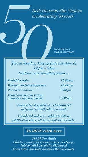 « All Events This event has passed. Celebrating 50 Years of BHSS May 23, 2021 @ 8:00 am - 5:00 pm « Shmooze and Havdalah via Zoom Shabbat Evening Service » Add to calendar Google Calendar iCalendar Outlook 365 Outlook Live Details Date: May 23, 2021 Time: 8:00 am - 5:00 pm Venue Beth Haverim Shir Shalom 280 Ramapo Valley Road Mahwah, NJ 07430 United States + Google Map Phone 201-512-1983 View Venue Website
