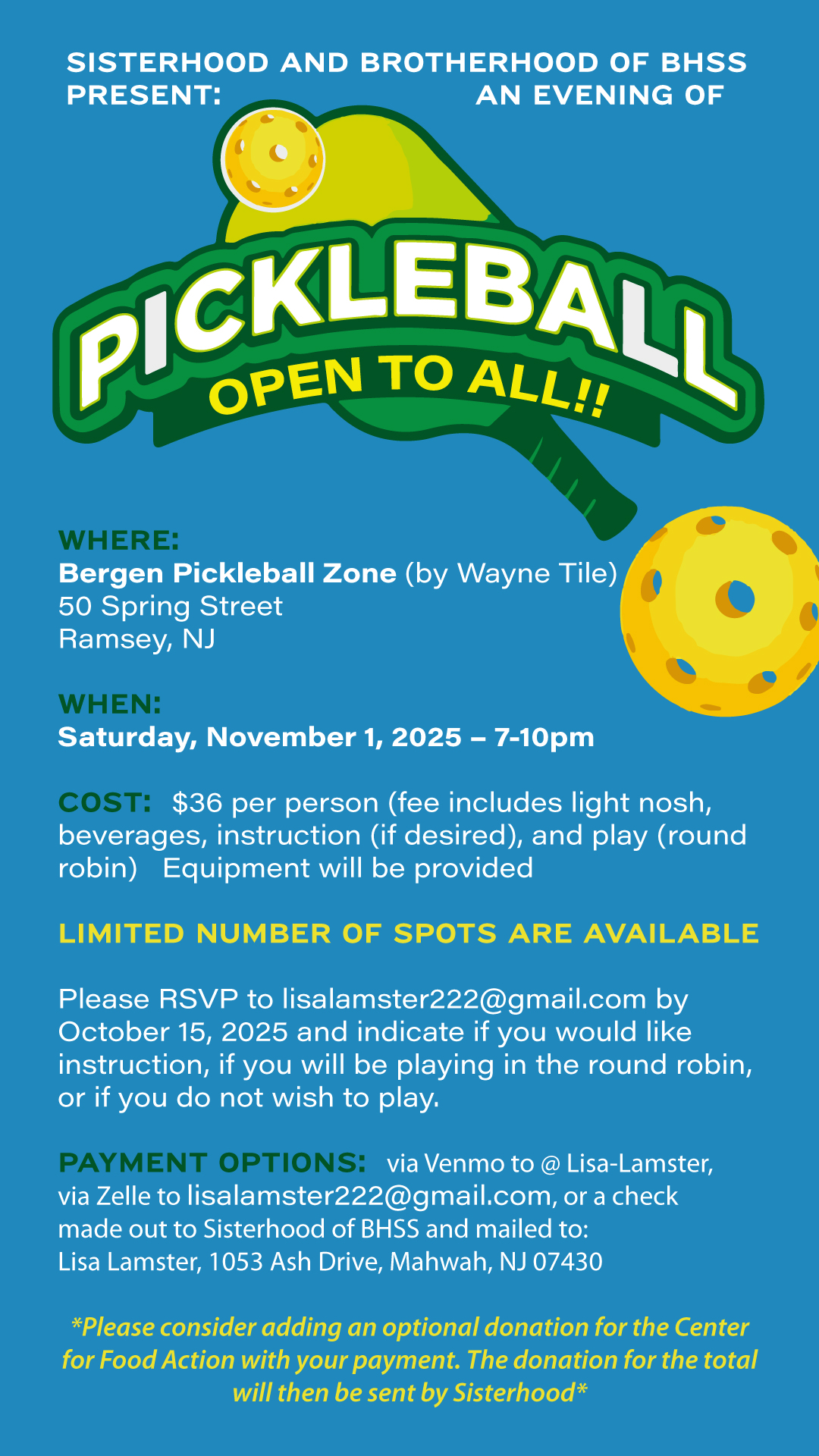 - Pick up a racquet and join the Brotherhood/Sisterhood Pickleball Outing on Saturday, November 1 at 7: at the Bergen Pickleball Zone in Ramsey, NJ *
